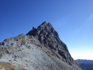 ここから岩場が始まります。鎖場が想像以上に長く、飯豊山はまーるい山と勝手に想像していたので、あれれと気を引き締めて登ります。下りの時に雨に降られたらイヤだなと考えていたのですが、翌日下山時にこの岩場通過する際、ピンポイントで雨に降られ、つるつる岩にビビり腰で下りました。