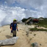 長い樹林帯と、崩落箇所のトラバースや鎖場を超えると、ようやく晴れ渡る青空とハイマツ帯にでます。